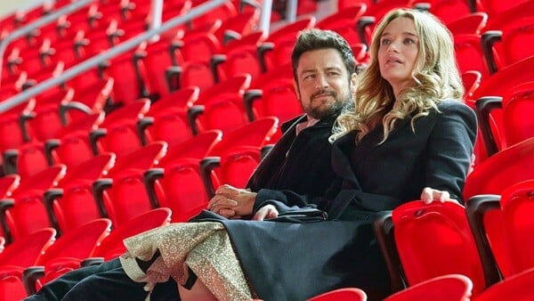 Image: (L-R) Holiday Touchdown: A Chiefs Love Story, Tyler Hynes, Hunter King Credit: ©2024 Hallmark Media/Photographer: Joshua Haines