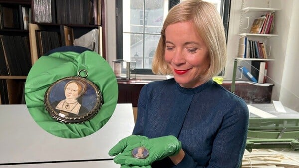 Image: Lucy Worsley holds a rare miniature portrait of the young Mary Tudor/PBS
