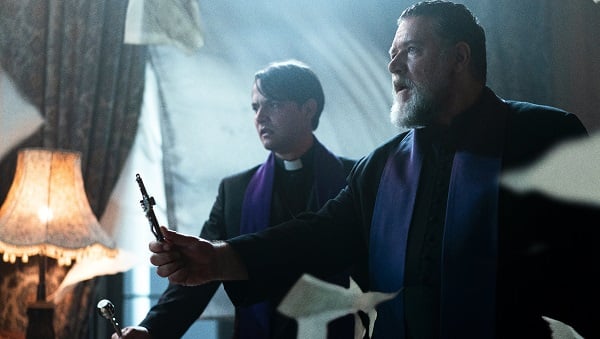 Image: Father Esquibel (Daniel Zovatto) and Father Gabriele Amorth (Russell Crowe) in Screen Gems’ THE POPE’S EXORCIST. Photo: Jonathan Hession. © 2023 CTMG, Inc. All Rights Reserved